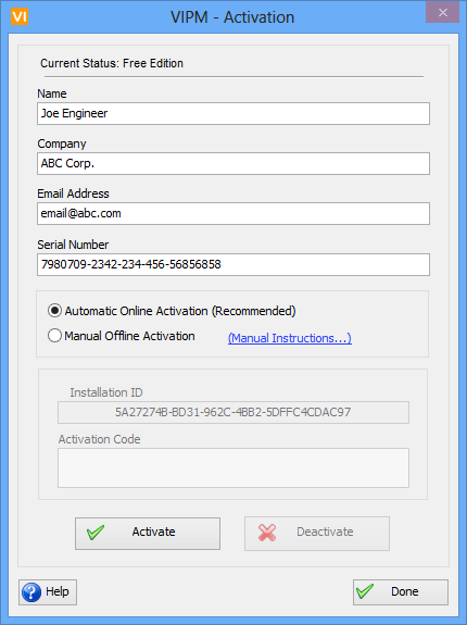 Activate: Click on this button to activate VIPM Pro automatically. A network connection is required. If you don’t have a network connection on this system, select Manual Offline Activation.