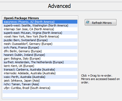 The only setting in the advanced tab is the configuration of the OpenG package mirrors. Mirrors are computer servers that are authorized by SourceForge and are located throughout the world and host the OpenG package files. It is recommended to order the mirror servers in the order you prefer to access them. Click and drag to reorder this list. Most of the time, the fastest server is the one that is geographically closes to your location.