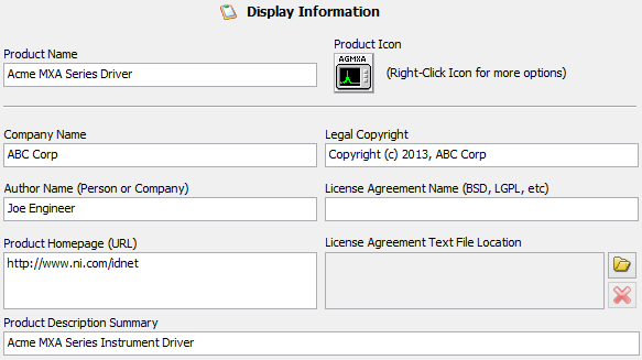 Product Name: Provide a user friendly readable product name. This should be your official public product name. This is displayed in the VIPM package list during installation and in the package information dialog. Since this is the first piece of information people see when looking for your product, you should include text that best describes your product.