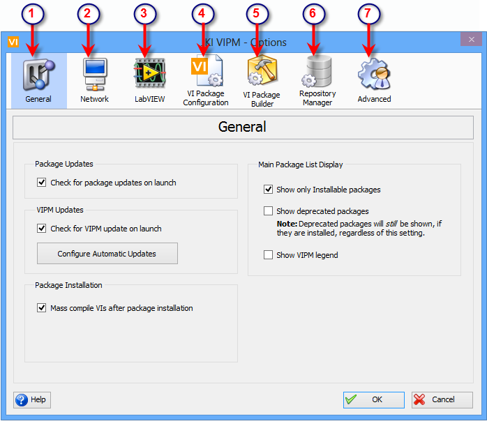 All configuration settings for VIPM are available under the options window. Clicking on Tools > Options in the menu of VIPM will display the options window as shown in the figure below.