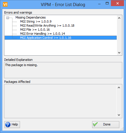 Missing Dependencies: This section lists all missing dependencies. Clicking on a missing dependency will show you which packages are missing dependencies under Packages Affected.