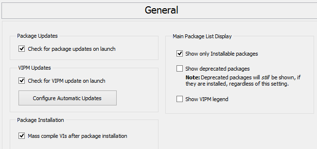 Check for Package Updates on Startup: Enabling this option will compare the packages currently listed in your library with the ones available over the internet every time VIPM is launched. If you do not have a connection to the internet then you may want to turn this option off to speed up the loading of VIPM.