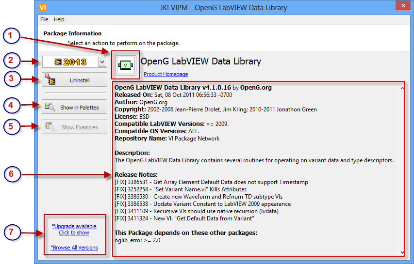 7. Other Versions Links: If the current package is not the latest, then VIPM will show a link to the latest package. If there are other versions available then VIPM will show a link where you can browse a list of all the package versions.