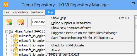 Save Troubleshooting File for JKI Support…: Selecting this menu option will allow you to save a special file that contains VIPM debugging information. This file can then be sent to JKI in a support ticket or email as an attachment. You will be prompted for a folder to save the file.