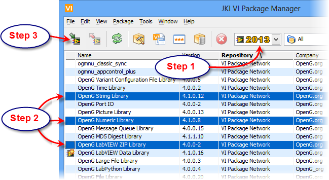 1. Select the LabVIEW version in which the packages are to be installed. This will refresh the list of packages for the selected LabVIEW version.