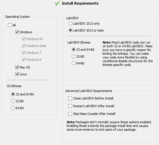 OS and LabVIEW Bitness: One thing to be carefull of is not to select conflicting requirements. For example, don’t select 32-bit OS and 64-bit LabVIEW. Your package won’t be installable.