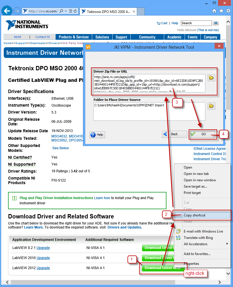You will need to have access to the original ZIP file of the driver that was downloaded from the IDNet website. You can also use the download link as shown in the image below. You will also need to have a target folder that VIPM will use to put the extracted driver source. This target location will be where any future development will happen on the package source. You can make changes to the driver source and then rebuild the package from there.
