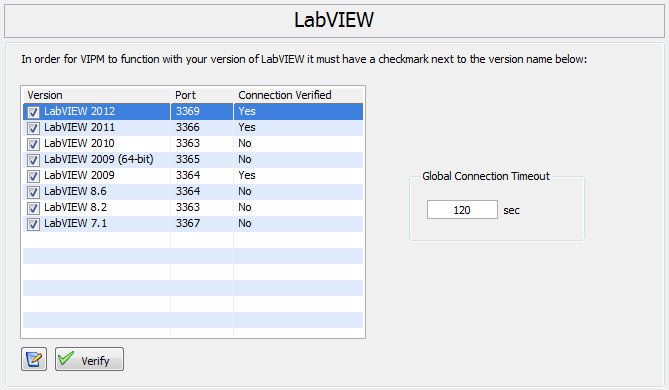 Verify: This button verifies the connection between VIPM and the selected LabVIEW version.