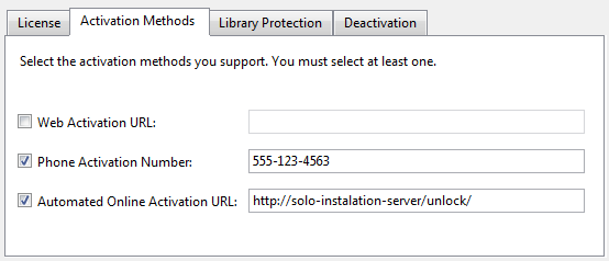 Automated Online Activation URL: This is the SOLO Server Activation URL for your add-on. This is the URL that is launched by the default web browser on the target machine when they want to log-in (using a license ID and password you provide) to get activation codes. This is also used to compute the automatic activation address. You can choose to allow automated online activation only if you have a SOLO Server license.