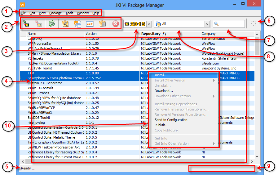 9. Progress Bar: This area will display a progress bar indicating progress of the selected user action. The progress bar is hidden when VIPM is not performing a progressive task.