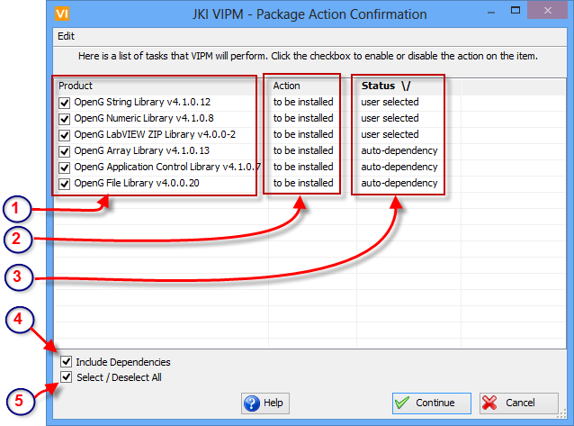 6. OK/Cancel: If you cancel this window then no action will be performed. If you click OK then the selected action will be performed and the status of your action can be monitored in the status bar at the bottom of VIPM. Once the actions are complete the Last Action Results Window will be displayed.