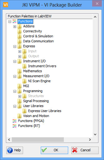 This dialog can be launched from the Palette Properties Page of the VI Package Builder Window. It allows you to browse your current LabVIEW installation for existing palette categories. You can pick any categories that are defined as being synced to a directory. Categories that are not synced to a directory are greyed out and disabled.