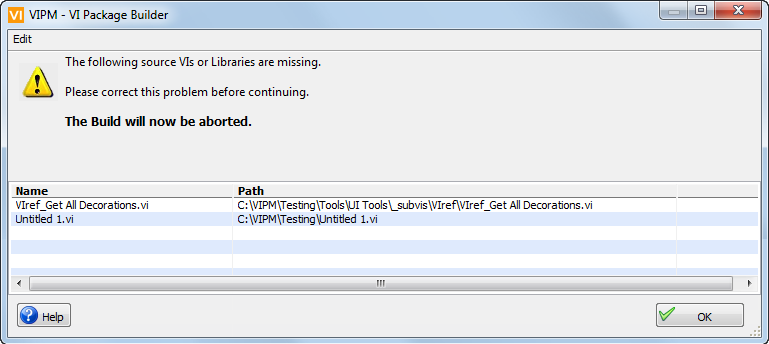 This window is displayed if VIPM encounters an error during a pre-build check of your source files.