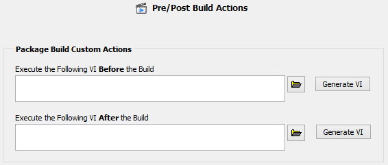 The pre/post build actions page of the VI Package Builder window allows you to define custom VIs to execute during the build process.