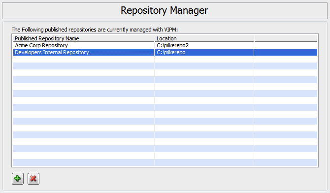 Remove Repository Button: Click this button to remove a repository folder to manage with VIPM. Removing a repository from this list does not affect the subscribers (VIPM clients) to this repository. It only removes it from the list of repositories that VIPM manages with the Repository Manager Window. Files, in the repository will not be affected.