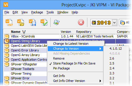 If other versions of the package are available then you can navigate to a specific version and switch to that version. Note: This menu item is only enabled if you have selected one or more packages that have other versions available. |