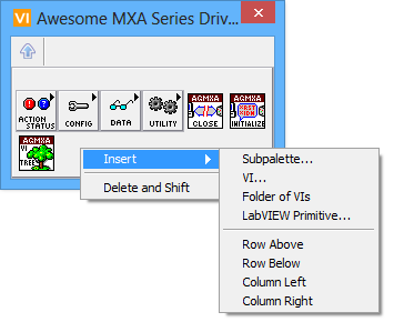 LabVIEW Primitive: Allows you to insert a LabVIEW primitive function in your palette. A dialog will pop-up where you can search for a primitive by name.