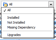 10. Package Show Filter This tool provides a basic show filter for the list of packages to be viewed. The following filters are available: All: Show all packages regardless of group type. Installed: Only show packages that are currently installed Not Installed: Only show packages that are not installed. Missing Dependency: Only show packages in the list that have missing dependencies or other errors. Upgrades: Only show installed packages that have newer versions available. |