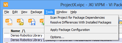 Scan Project for Package Dependencies: This scans your existing LabVIEW source code project and finds all packages in-use by that project. This will bring up a file dialog where you can browse to a project file, (*.lvproj) top-level VI or a folder of VIs to use as the basis of your scan. After the scan is complete you will be presented with a results list in a Package Action Confirmation Window