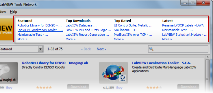 This section of the LabVIEW Tools Network View allows you to see the top 3 products in various categories. For example top 3 downloads, top rated etc.