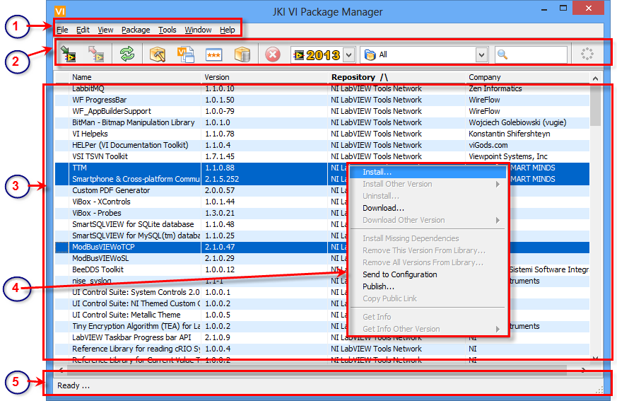 This section will discuss each part of VIPM in detail. The following screenshot highlights each section of VIPM.